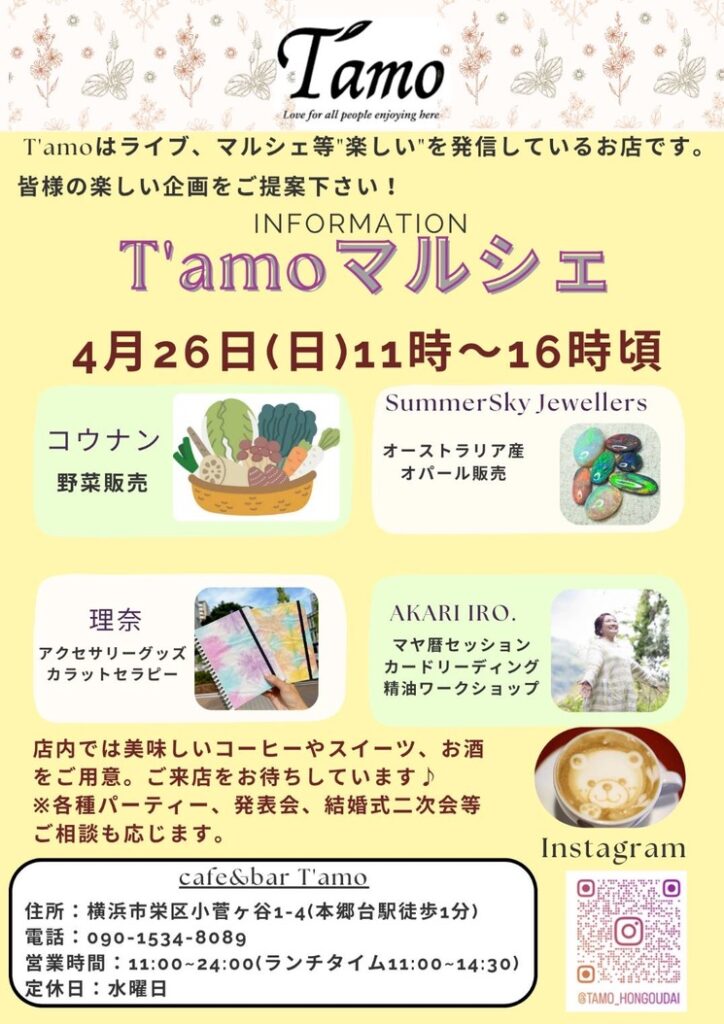 2026/4/26(日) 本郷台 Cafe&Bar T'amoさんマルシェ出展 2026年4月17日 最終更新日時 : 2026年4月17日 fujita 4月もT'amoさんの月例マルシェに出展させていただきます! 4月も3月とおなじく、ライトニングリッヂ産ブラックオパール原石の宝探しをご用意します! 本郷台での出展は、4月の次は9月になりそうです。ご興味ある石好きの方お待ちしております!! \ 最新情報をチェック /