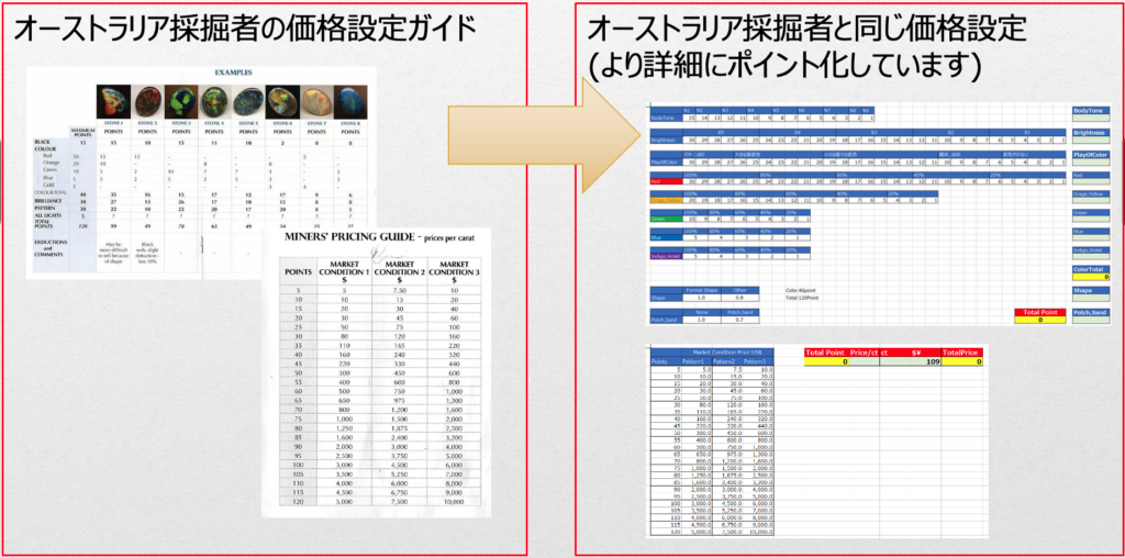 当店でのオパールの価格付けは、オーストラリア採掘者の価格設定ガイドを基準に項目をより精緻化した当店独自の評価基準によって行っています。経験則であったり、仕入れ値に利益率を付加する形での価格付けではなく、オパールの評価に対する分かりやすい価格設定を行っています。