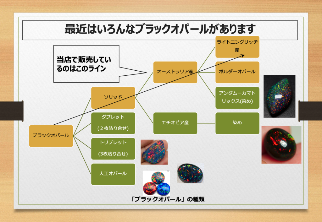 今は、インターネットなどで「ブラックオパール」と検索すると、様々な種類のオパールが検索されます。その中には、色を暗く染めたものや、貼り合わせの石も多くあります。それらの石は綺麗でお求めやすい値段なので私自身は、お客様のニーズにマッチすれば素敵な選択肢になると思っていますが、当店ではお取り扱いはありません。
